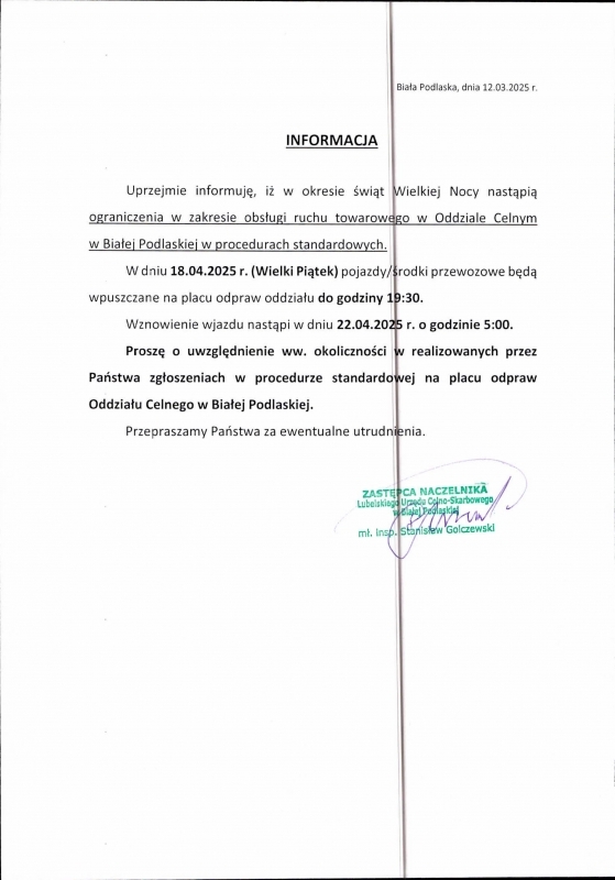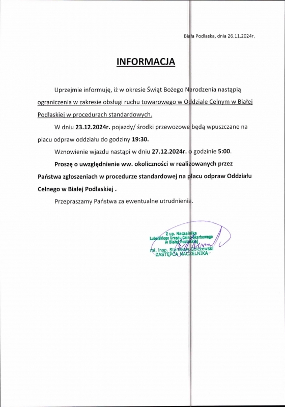 INFORMACJA - ODDZIAŁ CELNY BIAŁA PODLASKA