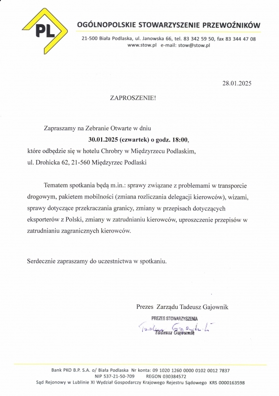 Zawiadomienie o Otwartym Zebraniu , w dniu 30.01.2025 r. w hotelu Chrobry w Międzyrzecu Podlaskim